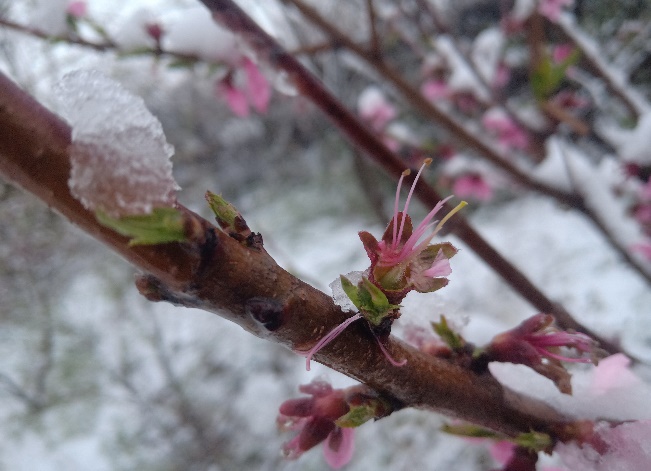 图8.潍坊临朐今年4月9日下雪,目前该地好多果树正处于花期,这场大雪给当地园艺植物带来的不利的影响。