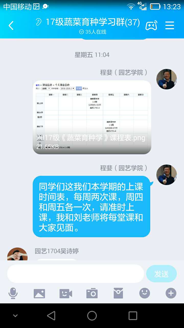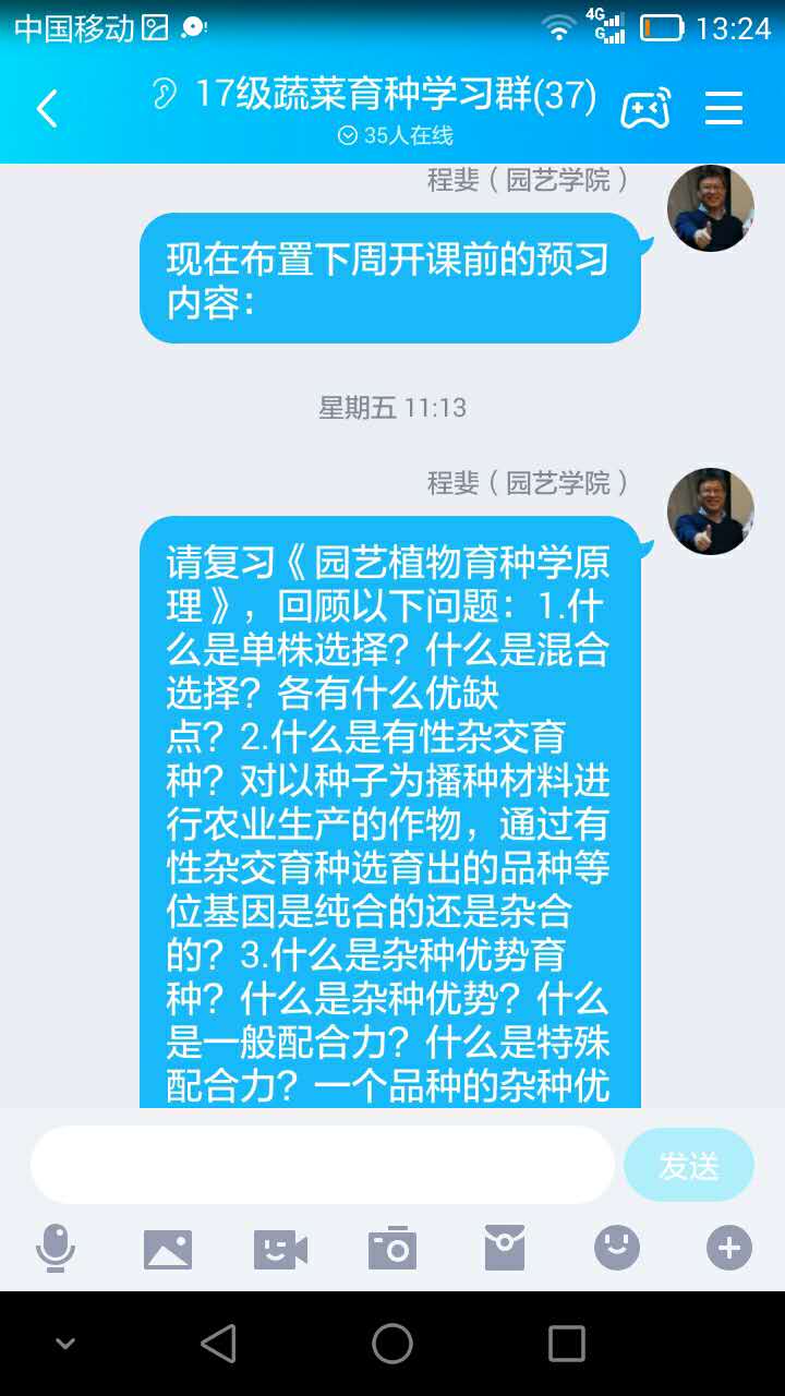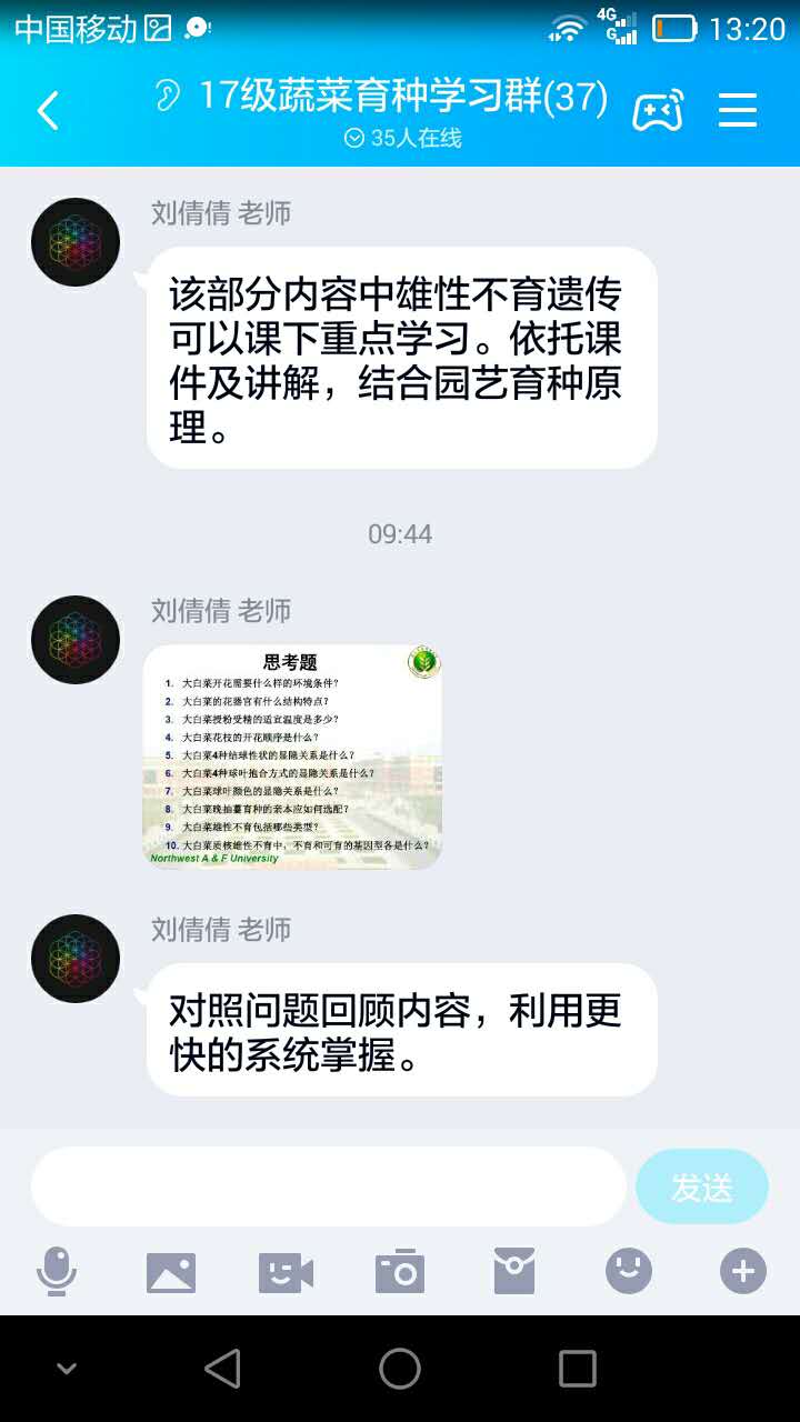 开课前一周,在班级干部支持下,将所有同学请进QQ群,一一上线核对,并针对即将开课的《蔬菜育种学》,请同学们复习其基础理论课程《园艺植物育种学原理》中的重要关联内容,布置好作业,告知课程表,明确上课时间。开课前一天晚上,在QQ群再次提醒第二天预备时间、点到时间、上课时间。确保每一个同学都知晓,逐一核实,无一缺漏。开课前利用预备时间要求所有同学签到,提醒开通学习通,进QQ群,进入语音状态,保证了所有学生全部到位,营造了良好、严肃而不拘谨的教学氛围。