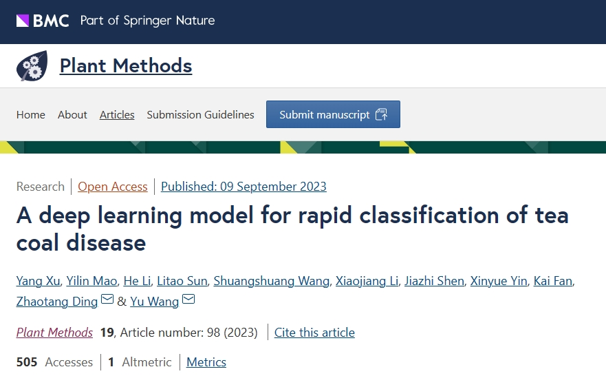 2023年8月27日,茶树育种团队在Plant Methods 发表了题为“A deep learning model for rapid classification of tea coal disease”的研究论文。beat365唯一官方网站正高级实验师王玉为论文共同通讯作者,beat365唯一官方网站茶学专业在读硕士研究生徐阳为第一作者。该研究得到了山东省茶产业技术体系首席专家项目、山东省农业良种工程项目、山东省农业科学院创新项目和山东省泰山学者专项基金等的资助。