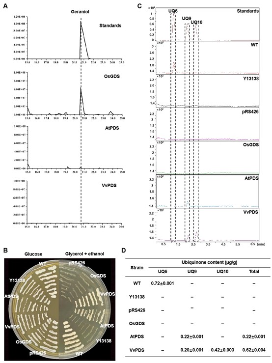 然而,葡萄中关于异戊烯基焦磷酸合酶家族的酶活性及生理功能研究仍然存在较大空白。本研究针对葡萄香叶基焦磷酸合酶(VvGDS)是否生成单萜化合物直接前体香叶基焦磷酸(GPP)的争议问题,通过亚细胞定位、酶学功能分析、转基因功能验证等证明VvGDS定位线粒体,编码长链异戊烯基焦磷酸合酶(因此,VvGDS被重新命名为VvPDS),该酶对泛醌(UQ10)的生物合成至关重要,而不是最初认为的合成单萜前体GPP的短链异戊烯基焦磷酸合酶。VvPDS不仅与已知的真核生物中参与UQ生物合成的长链PDS亲缘关系较近,而且其表达水平与不同葡萄组织中的UQ10含量呈正相关。体外酶学分析表明,VvPDS缺乏利用IPP和DMAPP作为底物催化GPP生物合成的能力,但是VvPDS能够功能性互补酵母coq1突变体,并催化UQ10和UQ9的生物合成。与野生型(WT)葡萄叶片相比,瞬时过表达VvPDS增加UQ10积累,而沉默VvPDS则降低葡萄叶片UQ10含量。综上所述,该研究解析了VvPDS具有长链异戊烯基焦磷酸合酶活性和参与葡萄UQ10合成的生理功能,不仅为葡萄中泛醌生物合成提供了生化和遗传学证据,而且为进一步探索葡萄长链和短链异戊烯基焦磷酸合酶功能提供了新的线索。