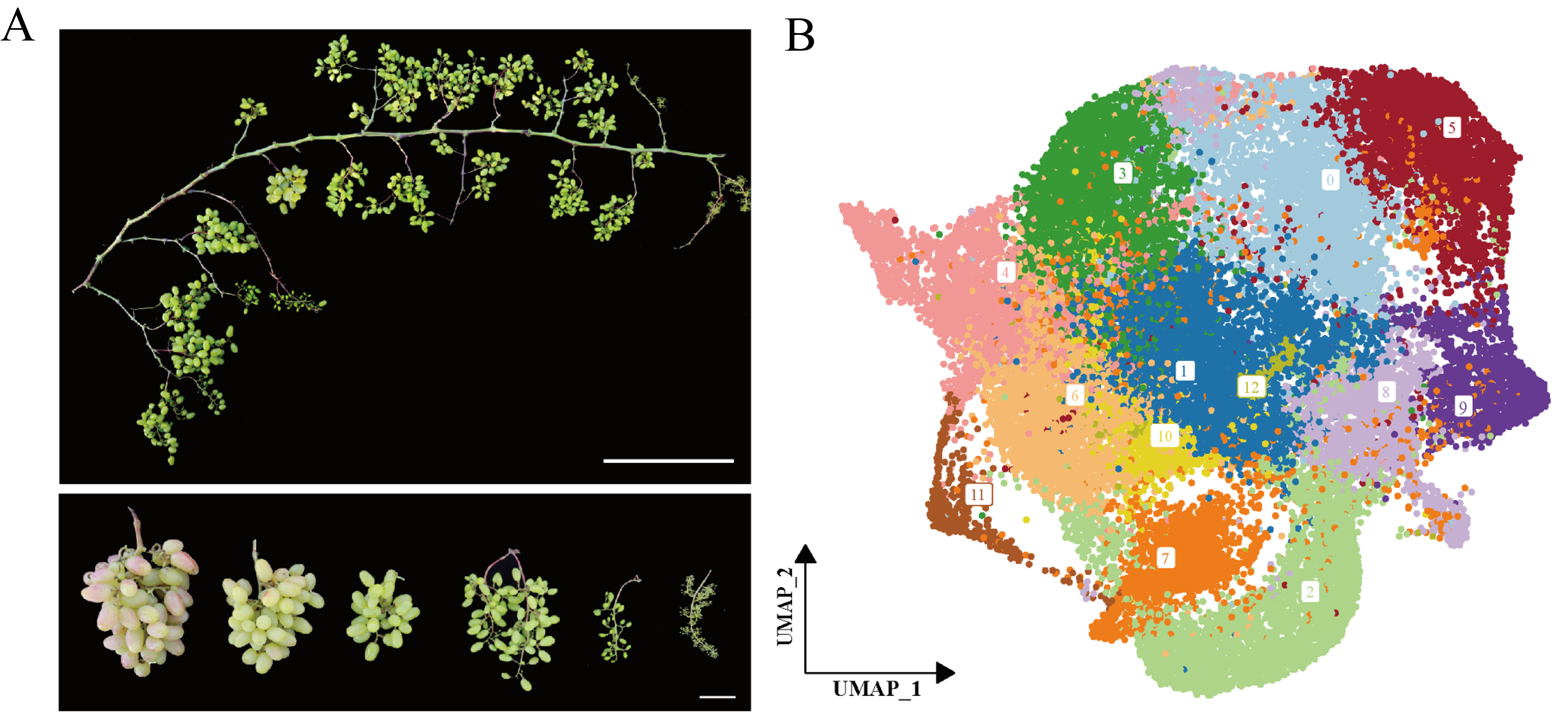 图1.‘朱利安’葡萄连续开花表型及芽单细胞图谱