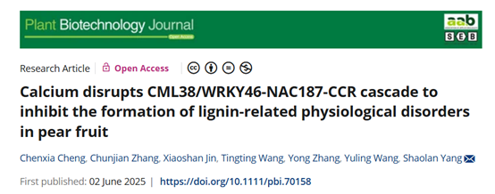 近日,beat365唯一官方网站杨绍兰/程晨霞团队在Plant Biotechnology Journal杂志在线发表了题为“Calcium disrupts CML38/WRKY46-NAC187-CCR cascade to inhibit the formation of lignin-related physiological disorders in pear fruit”的研究论文。