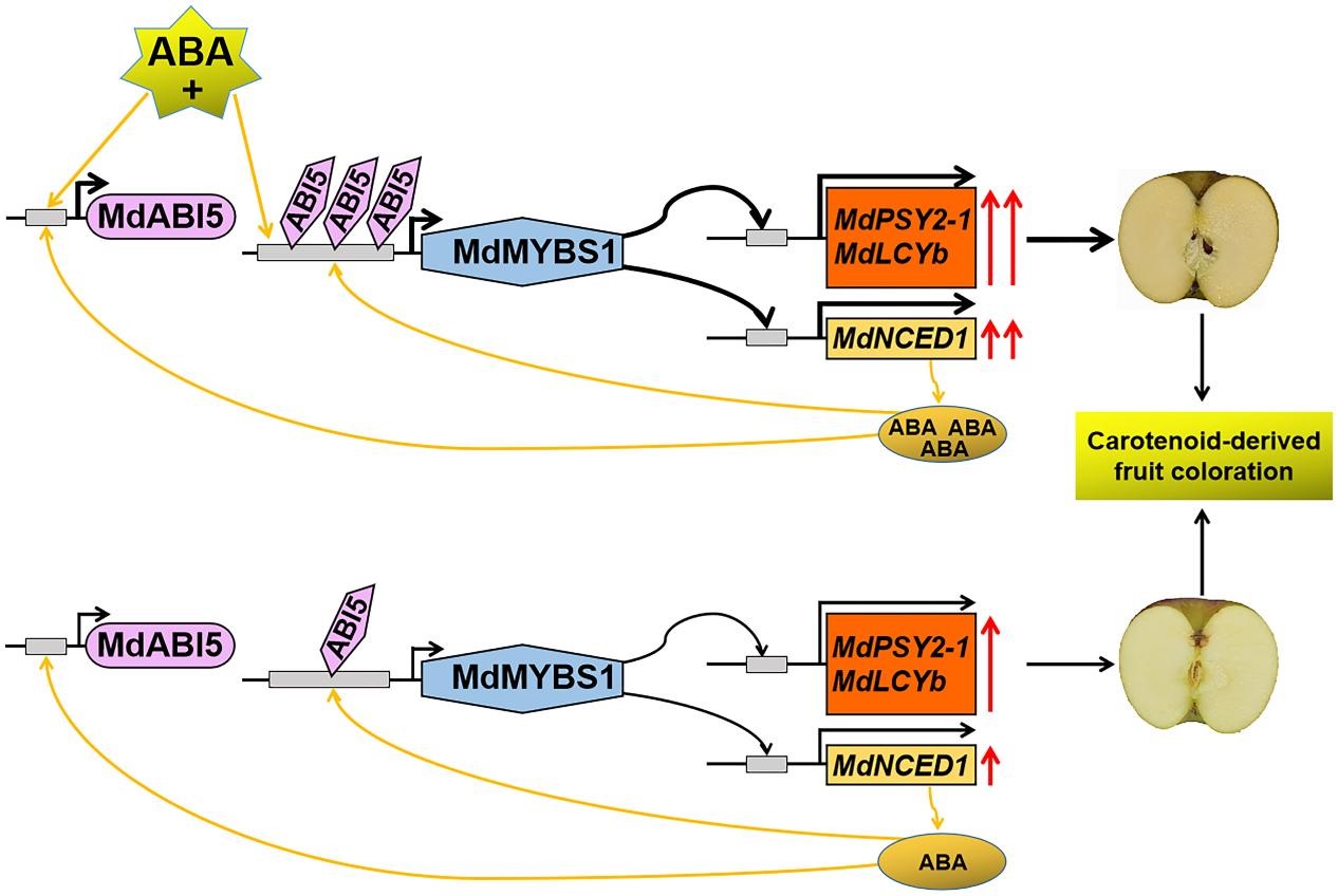 近日,beat365唯一官方网站原永兵/贾东杰教授团队在Plant Physiology上在线发表了题为“Abscisic acid activates transcription factor module MdABI5–MdMYBS1 during carotenoid-derived apple fruit coloration”的研究论文。该研究揭示了转录调控模块MdABI5-MdMYBS1响应ABA并调控苹果类胡萝卜素和ABA生物合成的分子机制。