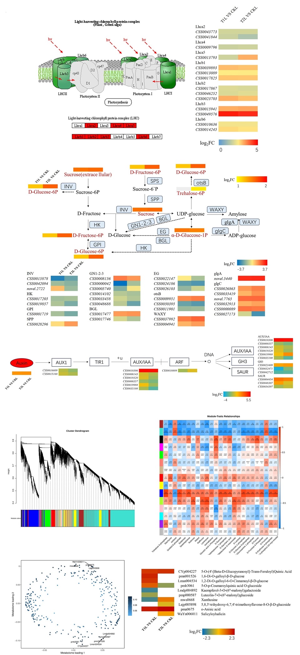 进一步研究发现,在ZnO NPs的影响下,Photosynthesis - antenna proteins通路中有显著性差异的基因全部上调表达,上调的基因中主要调控的是LHC(Lhca2、Lhca4、Lhca5、Lhcb1、Lhcb2、Lhcb3和Lhcb6)家族。有趣的是,与光合作用息息相关的Starch and sucrose metabolism通路中Sucrose、D-Glucose-6P、D-Fructose-6P、D-Glucose-6P等差异代谢物含量均显著提高。WGCNA和O2PLS分析也验证了上述结论。与此同时,在两种浓度ZnO NPs影响下,内源生长素含量均显著提高,这些可能是促进茶树新梢发育的内在动力。该研究还发现ZnO NPs会对茶树叶片和新梢中的矿质元素含量造成一定的影响,叶片中锌元素、钼元素、铜元素含量显著增加;新梢中的锌元素含量并没有增加,但在较低浓度下,对人体有益的硒元素和铁元素含量显著增加。