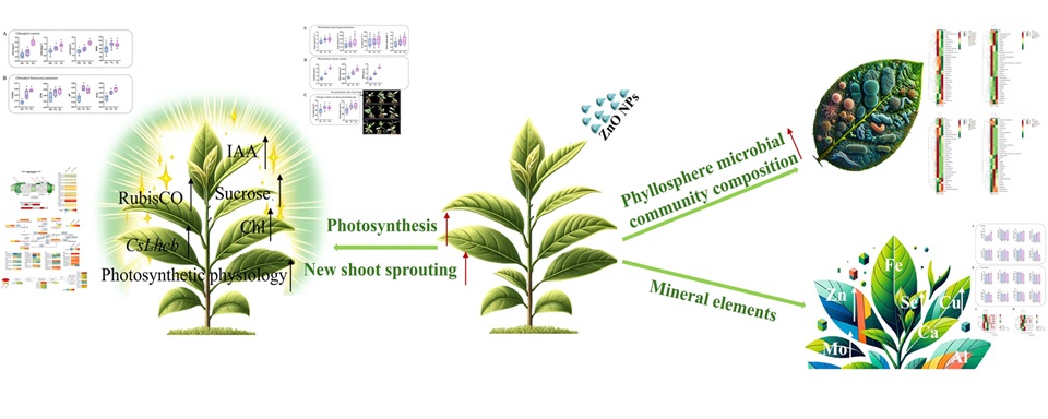 在当前农业科技迅速发展的背景下,纳米技术的应用已成为推动农业可持续发展的重要力量。特别是纳米氧化锌颗粒(ZnO NPs)在促进作物生长和提高作物品质方面展现出一定的优势。与此同时,光合作用是茶树生长和品质形成的关键过程,叶际微生物也对茶树的生长和健康具有一定的补充作用。然而,ZnO NPs对茶树光合作用、新梢发育和叶际微生物群落的影响尚不明确。