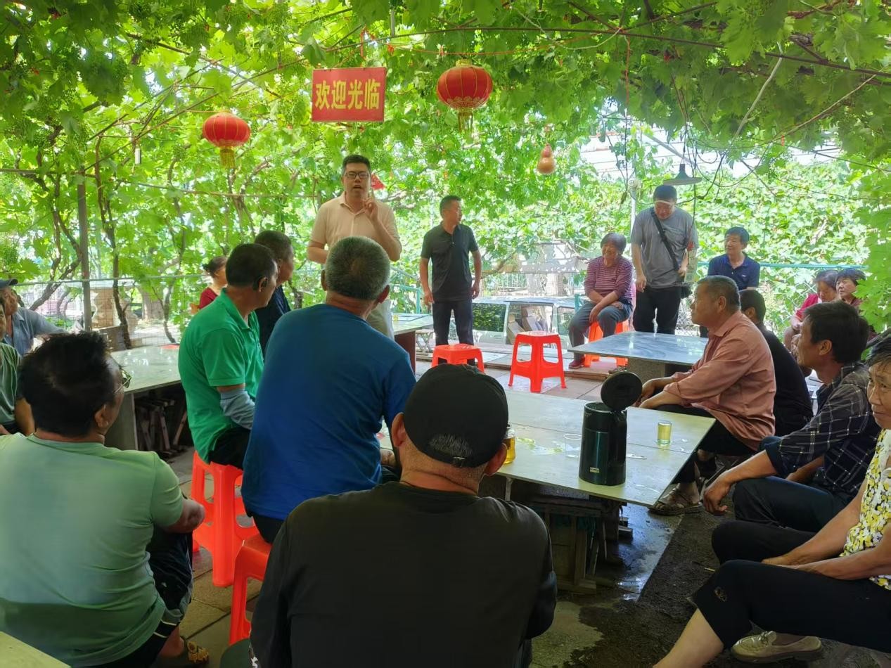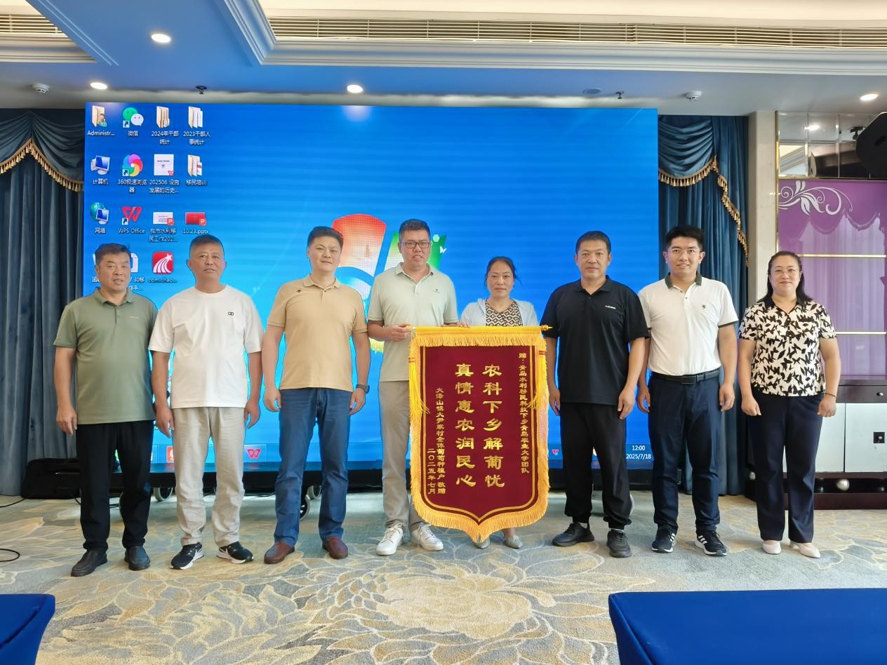 7月18日,平度市大泽山镇尹家村葡萄种植户代表向我校水利移民科技下乡服务团队赠送锦旗,青岛市水务管理局相关工作人员、农学院副院长张恩盈、beat365唯一官方网站副教授冷翔鹏、植物医学学院副教授任维超、经济管理学院教师熊伟等参加此次活动。