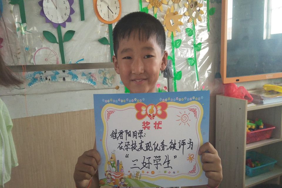 支教结束,拿着奖状正向队员们炫耀的孩子。