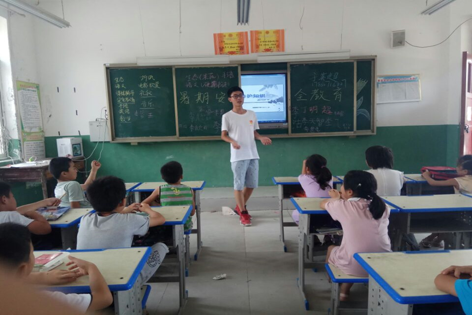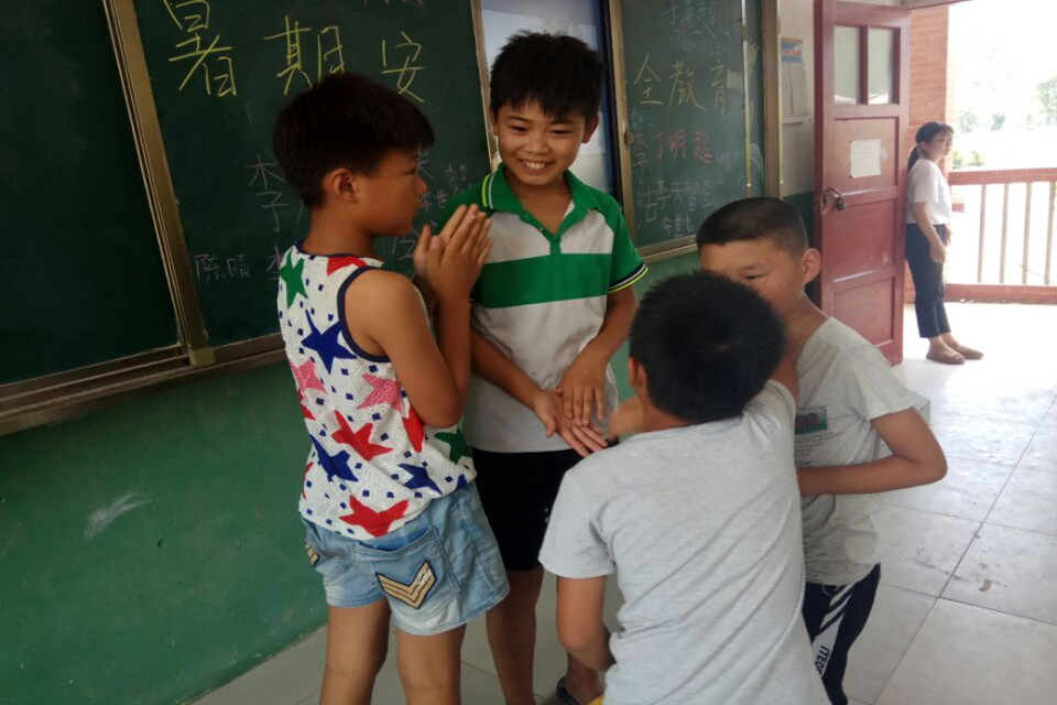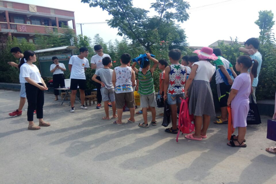 为了让队员与孩子们之间的关系更近一步,我们一起玩击鼓传花的游戏,鼓声停止时,花落在谁的手上,谁就要表演才艺。这一游戏让我们对农村孩子有了不一样的认识,他们能背诗,能唱歌,更有四个男孩子自己组团,一起自创起了小品,虽然内容在成年人眼里有点不切实际,但是我们队员能感受到孩子们纯粹的内心。