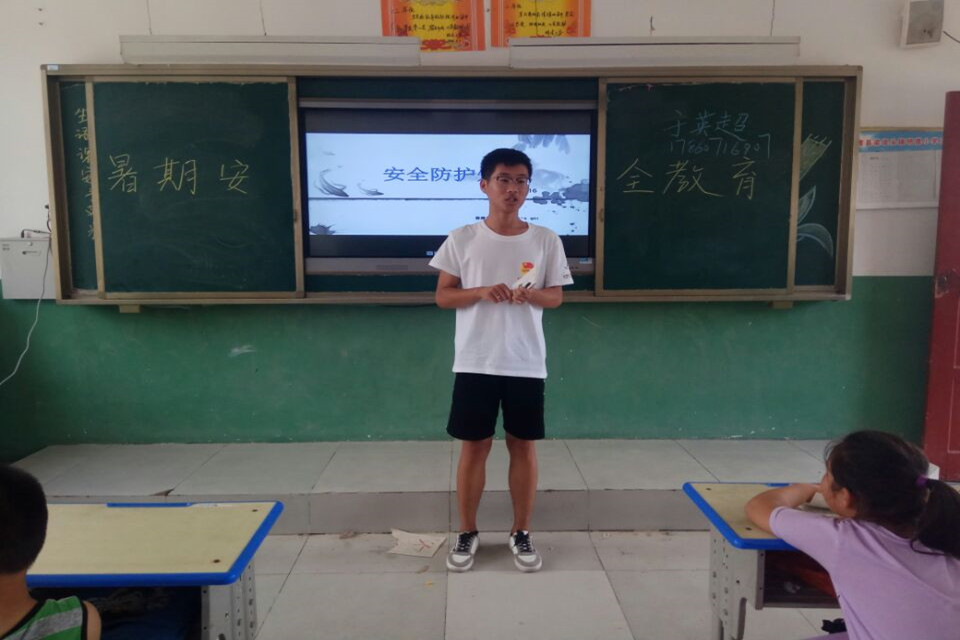 接下来我们正式开始教授我们准备好的课程,队员董翠娜给孩子们上了开学的第一节课——安全防护知识,上完课后的她又激动又惊喜。据她描述,当在黑板上写完字,回过头看到一个个端正的坐姿,一双双渴望的眼神,果然认真的孩子们都是最可爱的,心里说不出来的感动。