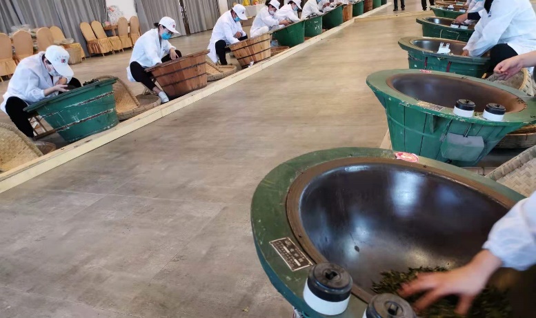 (2)制茶大赛(总分100分):参赛选手采用相同的茶树鲜叶利用炒锅手工制作崂山绿茶,要求工艺合理、制茶手法娴熟、茶叶外形不限。整个制茶工序需控制在3小时内完成。