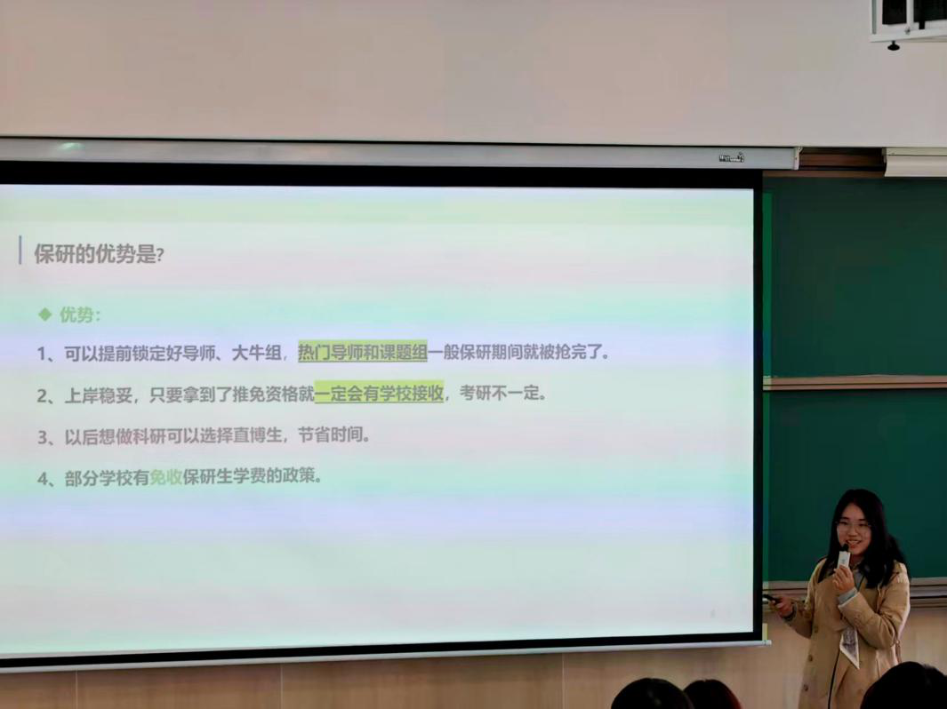 本次宣讲邀请了优秀学生代表园艺(创新)2201班学生尤思月。她结合自身经历,围绕专业知识学习、学科竞赛、社会实践、预推免经验等方面开展分享。她详细介绍了自己如何平衡课程学习与科研项目,在面对实验难题时如何查阅文献、与导师同学沟通协作,最终在大学生创新创业竞赛中取得优异成绩的过程。同时,她还分享了参与乡村振兴社会实践的见闻与感悟,鼓励新生们要将专业所学与社会需求相结合,在实践中增长才干、锤炼品格。谈及保研经历,她鼓励同学们尽早明确目标,注重日常积累与能力提升,制定科学的学习计划,保持积极心态应对挑战。