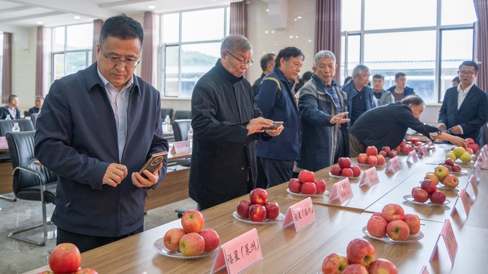 在品鉴环节,专家们逐一品尝了苹果新品种,从外观、风味、质地、口感、甜度等因素进行鉴评,并围绕苹果产业新品种选育、新技术推广和新模式探索等方面展开研讨交流。