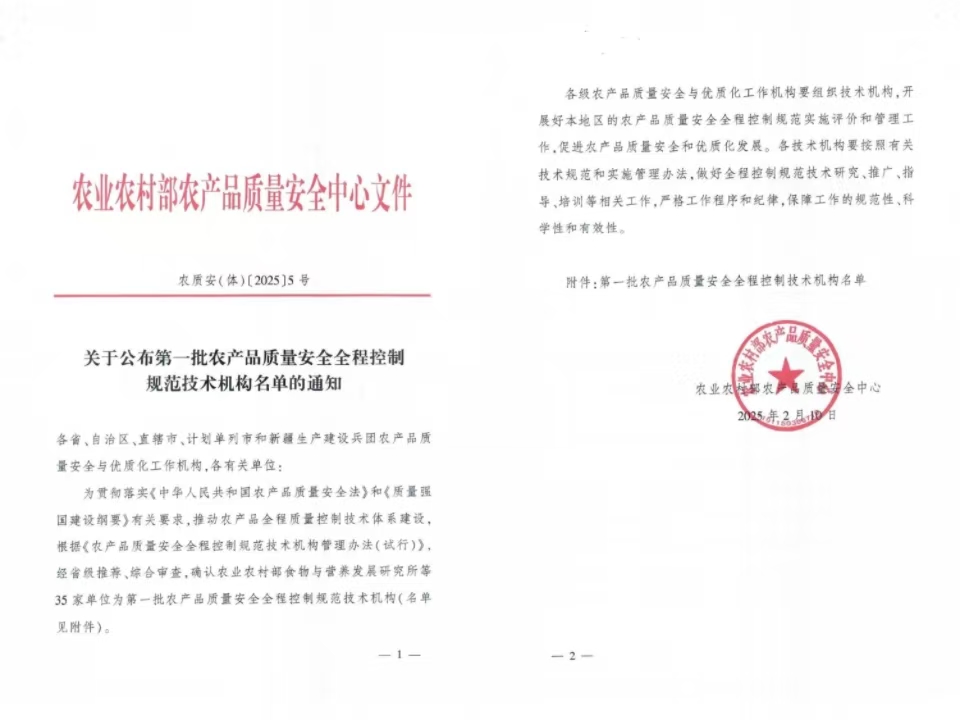 为贯彻落实《中华人民共和国农产品质量安全法》和《质量强国建设纲要》有关要求,推动农产品全程质量控制技术体系建设,近日,农业农村部农产品质量安全中心(以下简称部农安中心)根据《农产品质量安全全程控制规范技术机构管理办法(试行)》,经省级推荐和综合审查,确认35家单位为首批农产品质量安全全程控制规范技术机构,并以“农质安(体)〔2025〕5号”文正式公布。beat365唯一官方网站以beat365唯一官方网站聂继云教授为技术机构负责人,牵头组织技术专家团队,以果蔬茶等园艺作物为重点,成功申报入选,业务范围为作物种植。