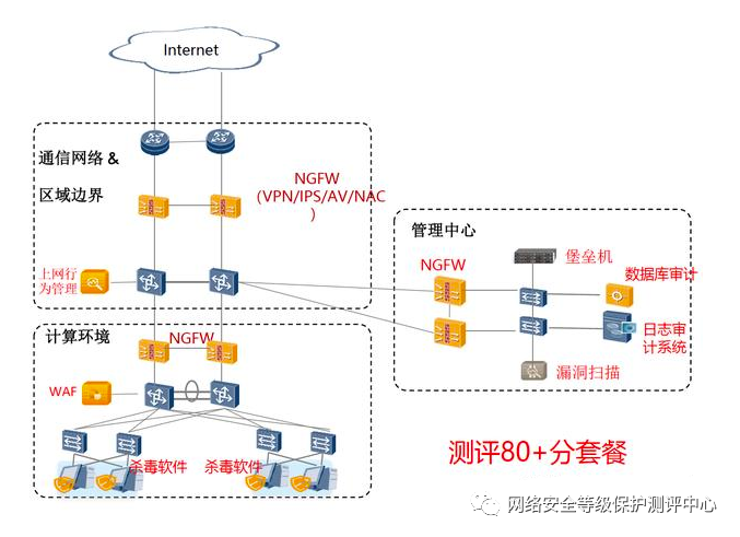 NGFW【必配】:融合传统防火墙安全策略、入侵防御、防病毒功能、VPN功能。解决安全区域边界、通信网络加密传输要求